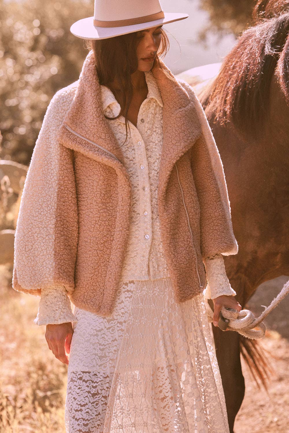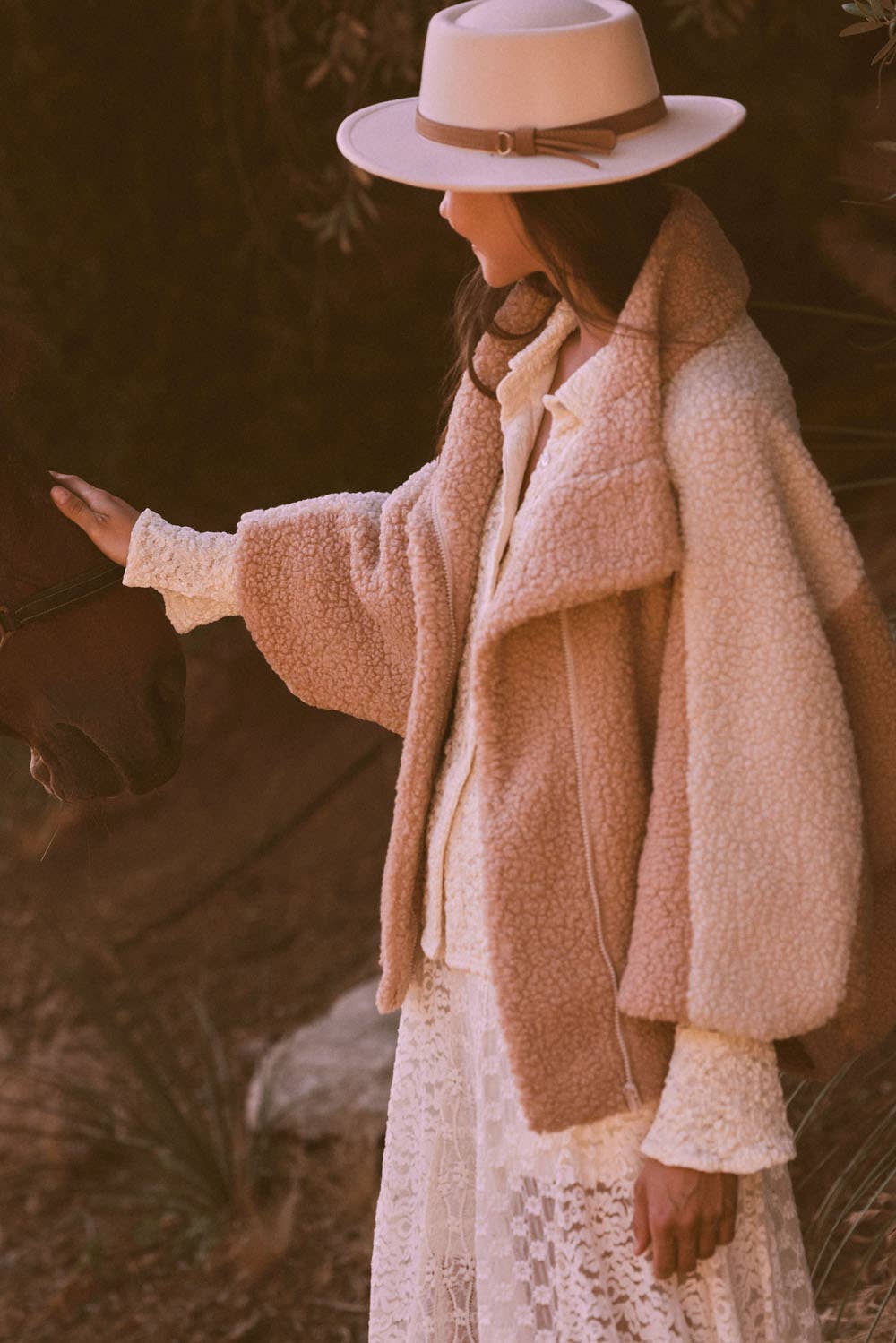 Cozy colorblock sherpa fleece jacket with a high collar, zip-up front, and relaxed fit. Features soft faux shearling fabric, long sleeves, and full lining for warmth and comfort. Hip-length cut with a yoke back detail.