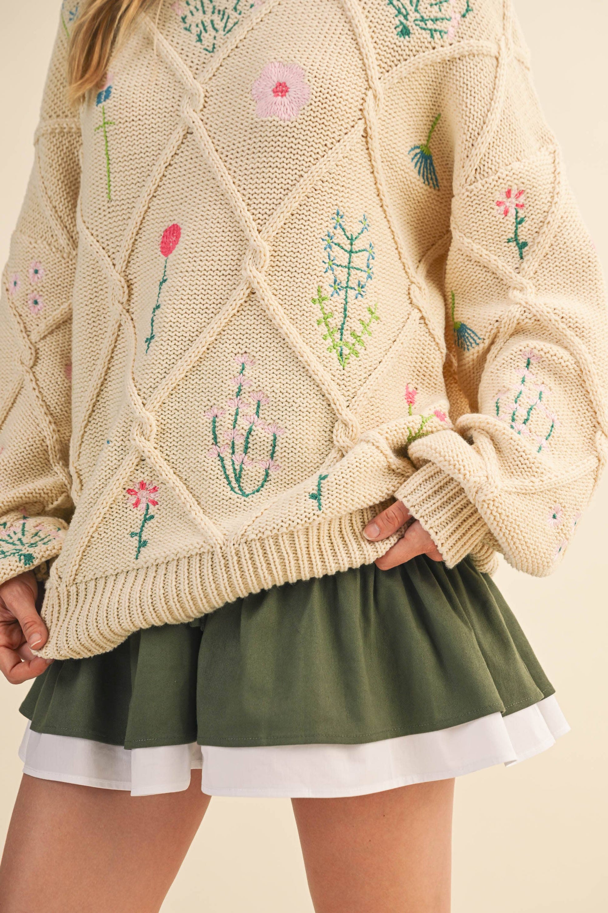 This cozy sweater features a beautiful floral embroidery and a unique lattice cable design. It's sure to add a touch of elegance to your wardrobe while keeping you warm and comfortable.